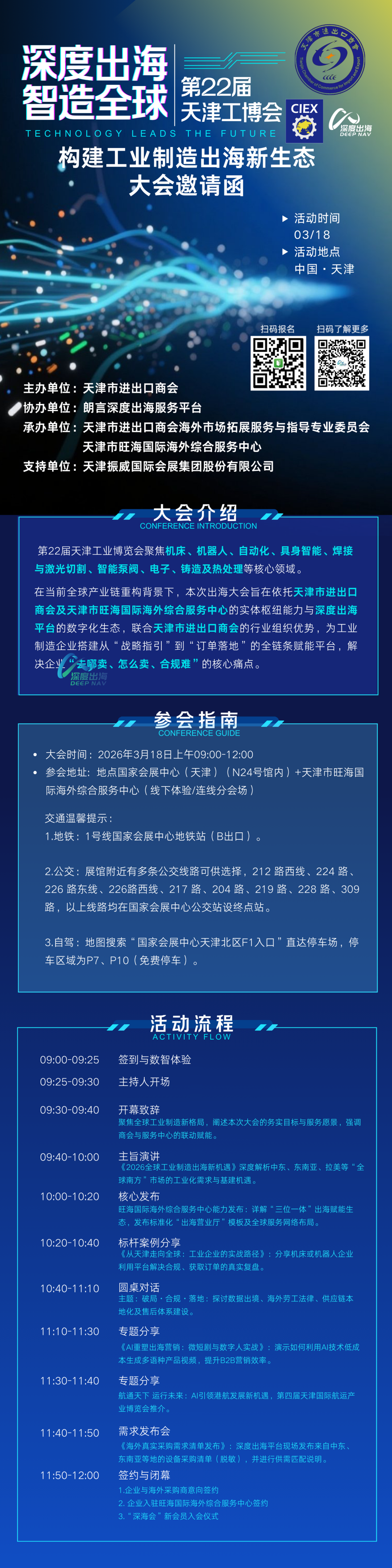 【邀请函 · 天津】天津工博会开幕在即!深度出海携“采购清单”现场对接,助您拿下海外订单! 天津工博会 2026年3月15日 09:00 天津 在小说阅读器中沉浸阅读 以下文章来源于深度出海 ,作者深度出海 深度出海 . 产业互联网第四方平台,搭建企业出海智能AI咨询及服务平台。通过国内外双向资源对接,对内联合政府、行业协会、优质服务机构;对外联接当地的服务能力。依据服务领域差异分类,与第三方专业服务机构携手合作。构建出一套涵盖企业出海服务全领域生态体系。发表时间:2026-03-17 15:06